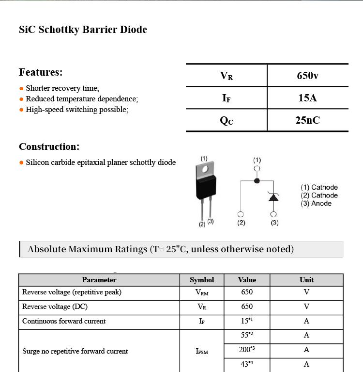 SiC Schottky diode SBD 650V 2~100A TO220 packaged high-voltage electronic components